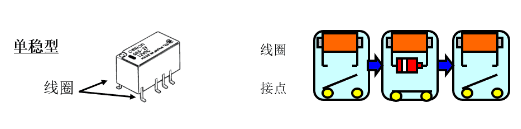 單穩(wěn)型:在線圈得電時(shí),接點(diǎn)執(zhí)行動(dòng)作,而線圈失電的時(shí)候,接點(diǎn)就會(huì)復(fù)位。如下圖所示: