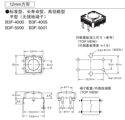 其中12mm方形(如下圖)主要包含有標準型B3F-4000系列,長壽型B3F-5000系列和高度賴型B3F-5001系列。具體額定值及性能歡迎登錄廣州鼎悅電子科技有限公司官方官網(wǎng)進行查閱和咨詢。
