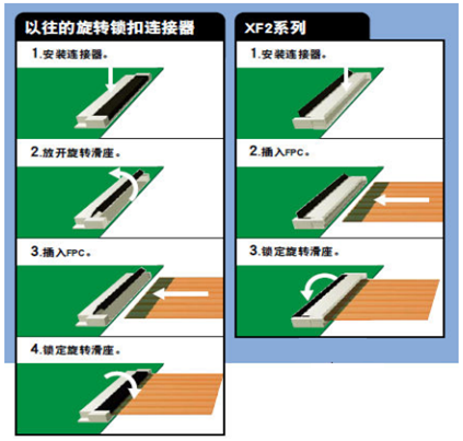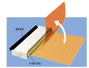 一、 旋轉(zhuǎn)式滑座從FPC插入口獨(dú)立出來。這樣一來,提起FPC時(shí),滑座并不會斷開。這就保證了即使受到過度的外力,安裝好的FPC也不會脫開。