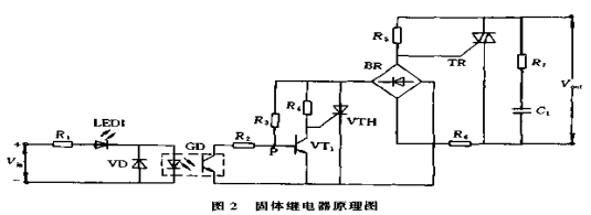 這里僅以應(yīng)用較多的交流過(guò)零型固體繼電器為例,介紹其工作原理。該電路采用了過(guò)零觸發(fā)技術(shù),具有電壓過(guò)零時(shí)開啟,負(fù)裁電流過(guò)零時(shí)關(guān)斷的特性,在負(fù)載上可以得到一個(gè)完整的正弦波形,因此電路的射頻干擾很小。該 電路由信號(hào)輸人電路、零電壓檢測(cè)控制電路、工作指示電路、雙向晶閘管控制電路和吸收電路幾部分組成。采用了光電耦合器GD作為輸入電路和輸出電路之間的隔離元件,VD是防止Vin正負(fù)接反燒壞GD。