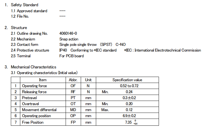 D2FC-F-7N (20M) 克力為:60+/-15G,壽命為2000萬次;