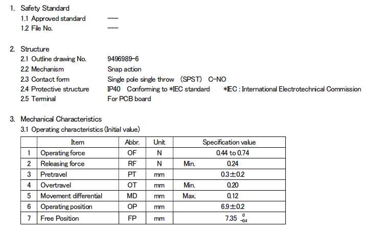 D2FC-F-7N (20M) 克力為:60+/-15G,壽命為2000萬次;