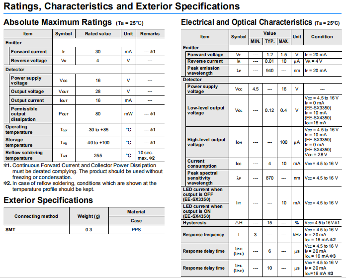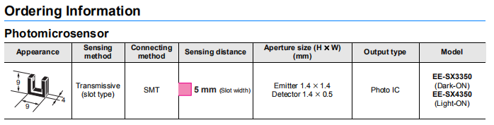光電IC輸出(遮光時ON(EE-SX3350)/入光時ON (EE-SX4350)備有2種型號)